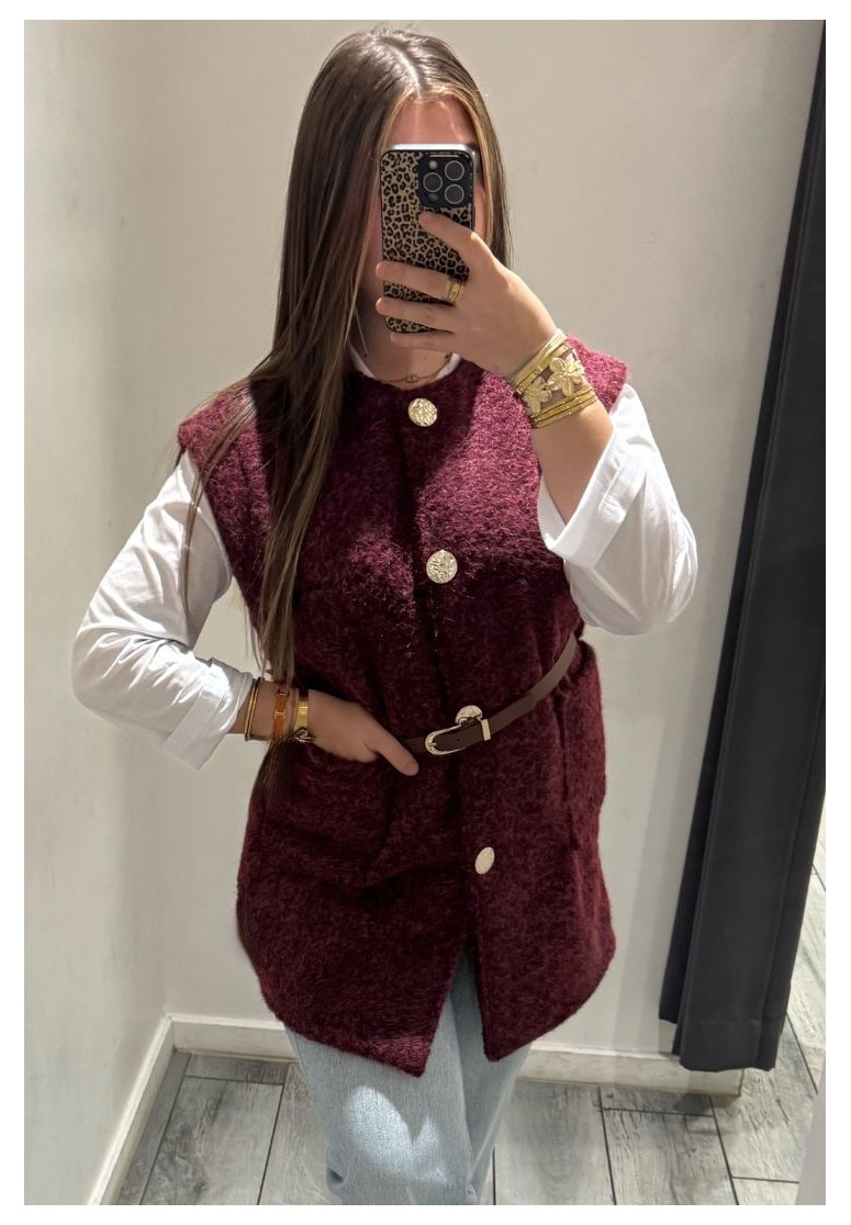 Gilet sans manches bordeau à boutons dorés avec ceinture