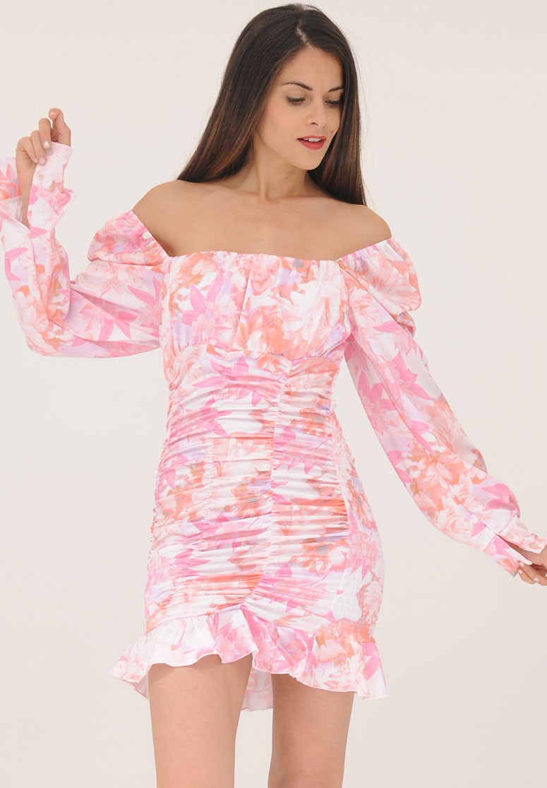 Robe courte élastique orange / rose satinée à grosses fleurs
