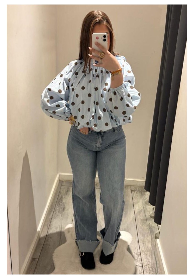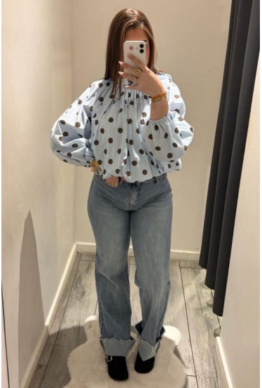 Blouse dos nu bleue à pois marrons